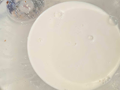 With a hand mixer beat the almonds, you'll see the water change to milk right away. Beat until almonds turn to a pulp, about one minute.
